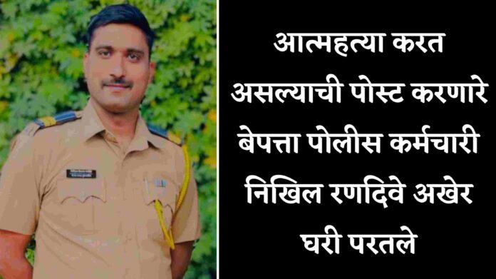 पुणे : यवत पोलिस ठाण्याअंतर्गत असणाऱ्या केडगाव पोलीस चौकी येथे अगोदर कार्यरत असणारे पोलीस कर्मचारी निखिल रणदिवे हे अखेर घरी परतले आहेत. याबाबतची माहिती शिक्रापूर पोलीस ठाण्याचे पोलीस निरीक्षक दीपरत्न गायकवाड यांनी माध्यमांना दिली आहे. मागील पाच दिवसांपूर्वी त्यांनी वरिष्ठ अधिकाऱ्यांच्या जाचाला कंटाळून आत्महत्या करत असल्याची पोस्ट केली होती यामुळे संपूर्ण पोलीस दलात खळबळ माजली होती. ते व्हाट्सअप स्टेटस ठेवून ते बेपत्ता झाल्याने सर्वांनाच काळजी लागली होती.